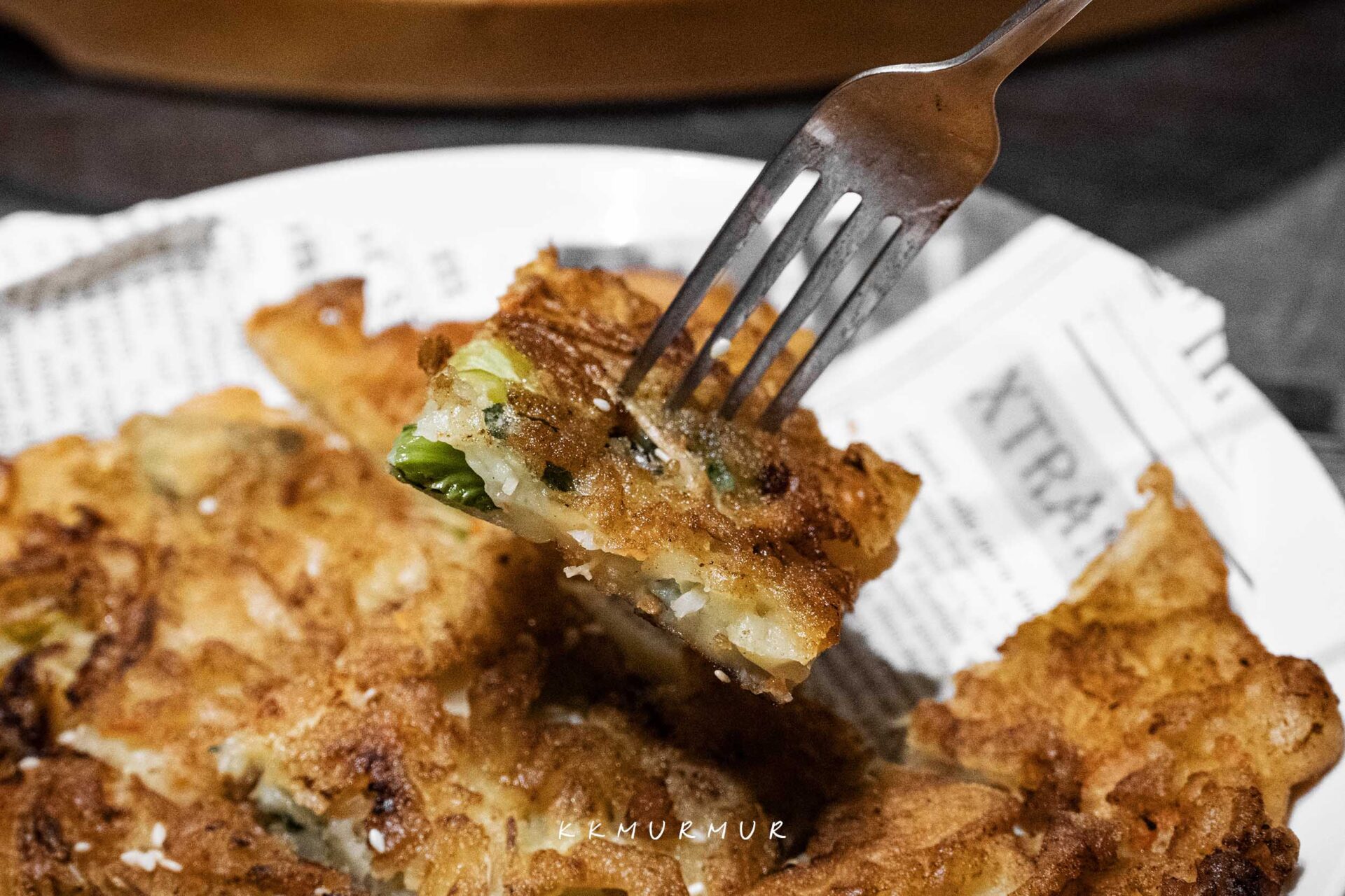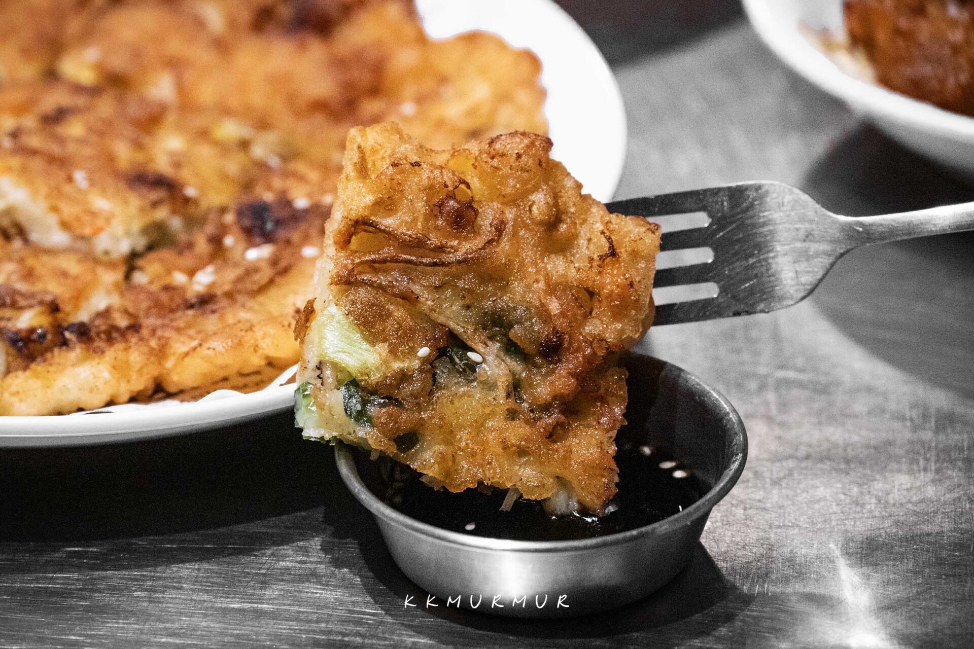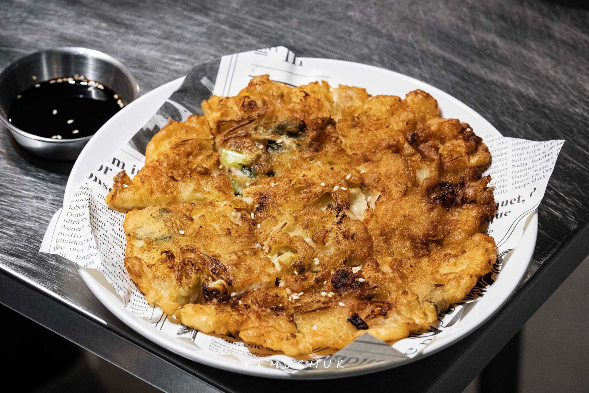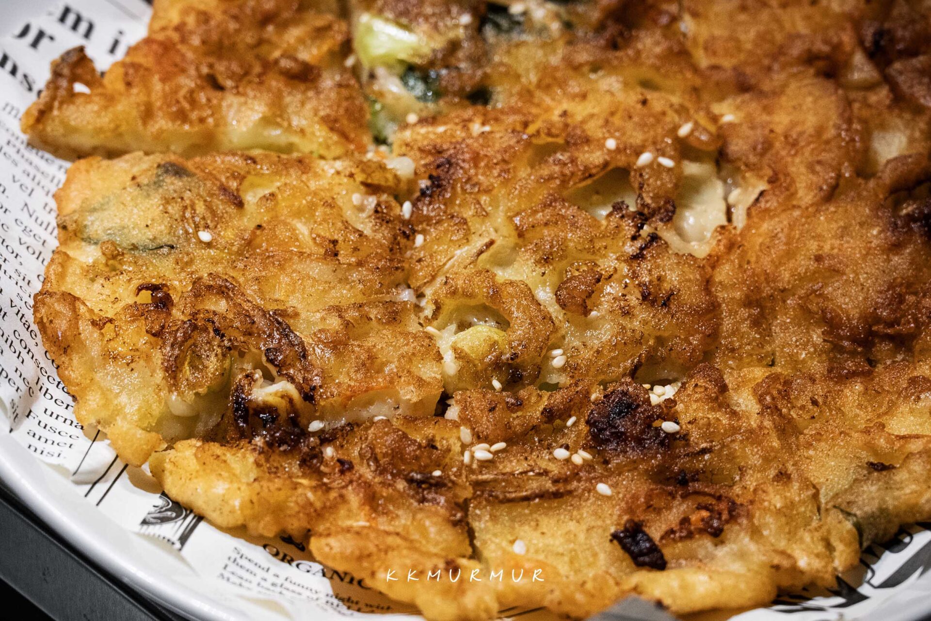 【海鮮煎餅】不算太厚,但意外的很不錯欸,表皮酥脆誘人,即便冷掉吃也是口感依舊,內餡柔軟而鮮美,能吃到蝦子與花枝的鮮甜,彼此平衡得滿好。