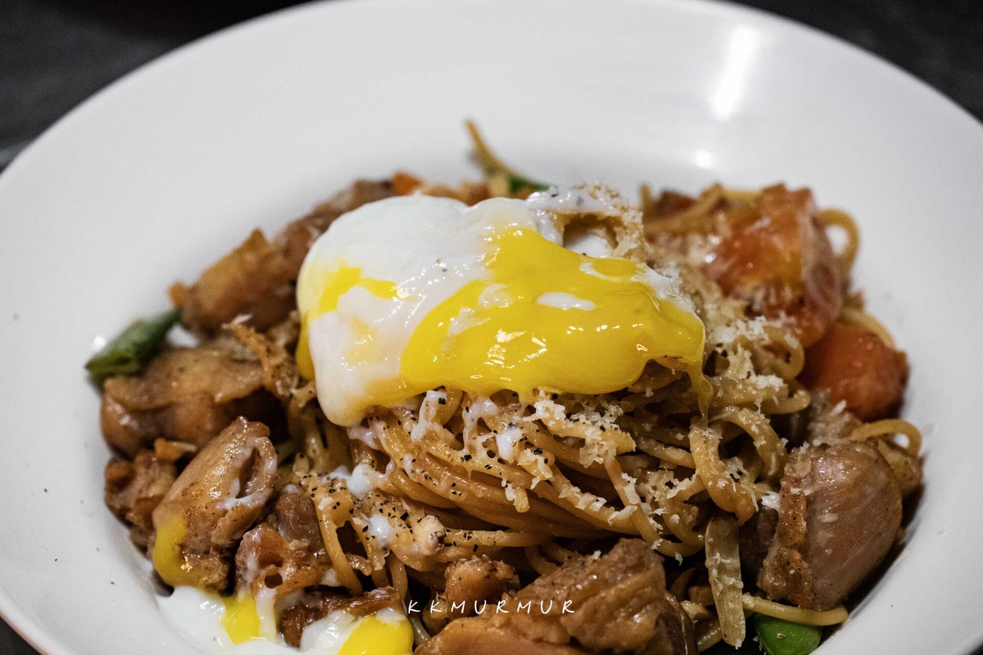 雞丁醬油義大利麵 $238、溫泉蛋(加購) $23