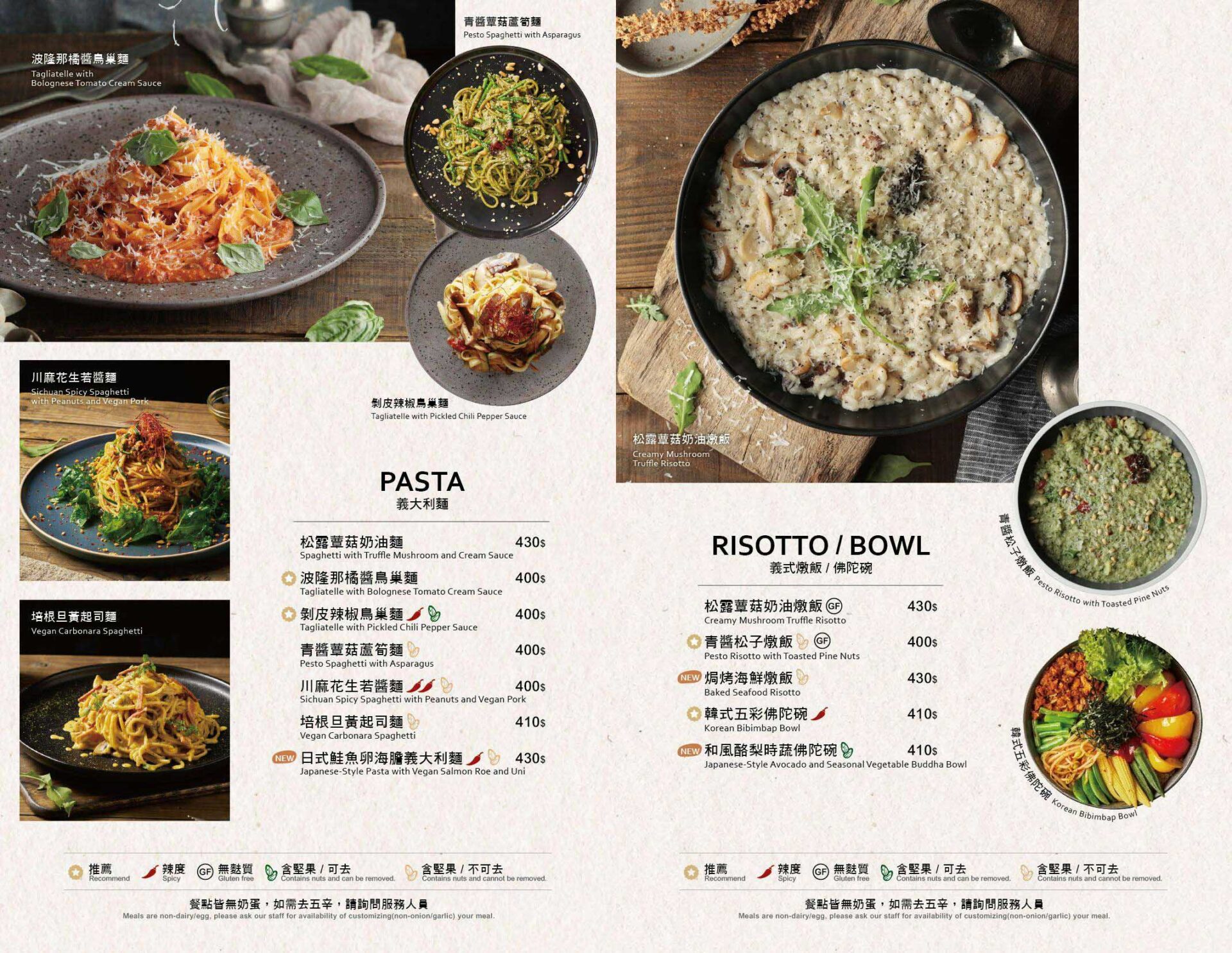 【VEGAN AMORE 蔬慕】的菜單如上,包括開胃菜、沙拉、湯品、義大利麵/燉飯、佛陀碗、漢堡、燉菜、甜點與各式飲品,品項與種類豐富有多元。全菜單基本是無使用蛋與牛奶,並以植物燕麥奶、Omnipork等全素食材來替代使用。店內餐點在點餐時,皆可以選擇要五辛素或全素,可以根據心情與需求來挑選。