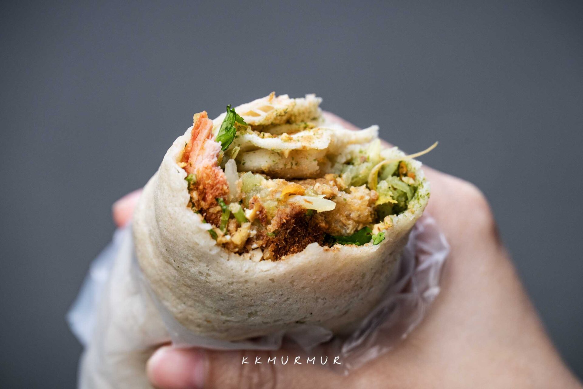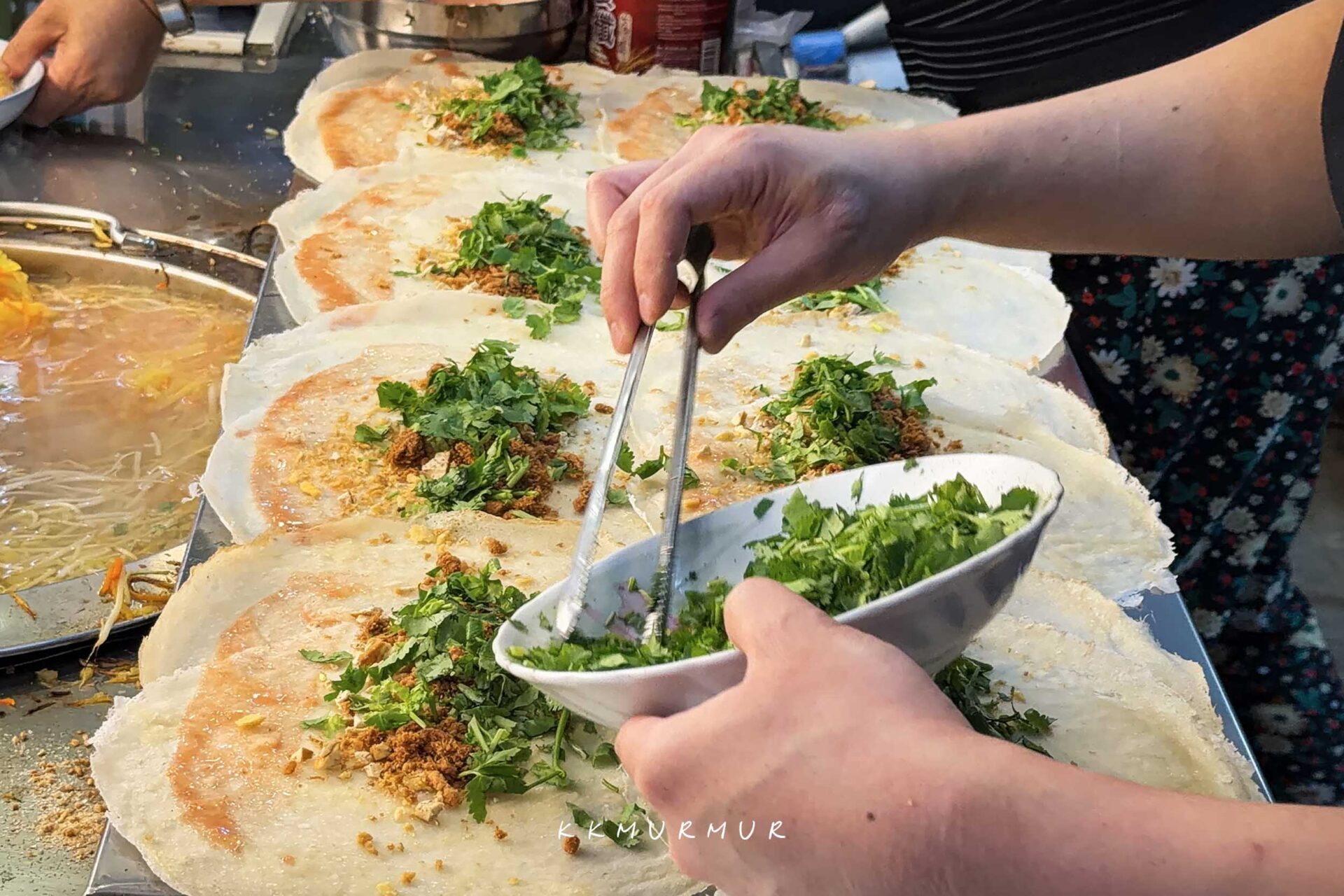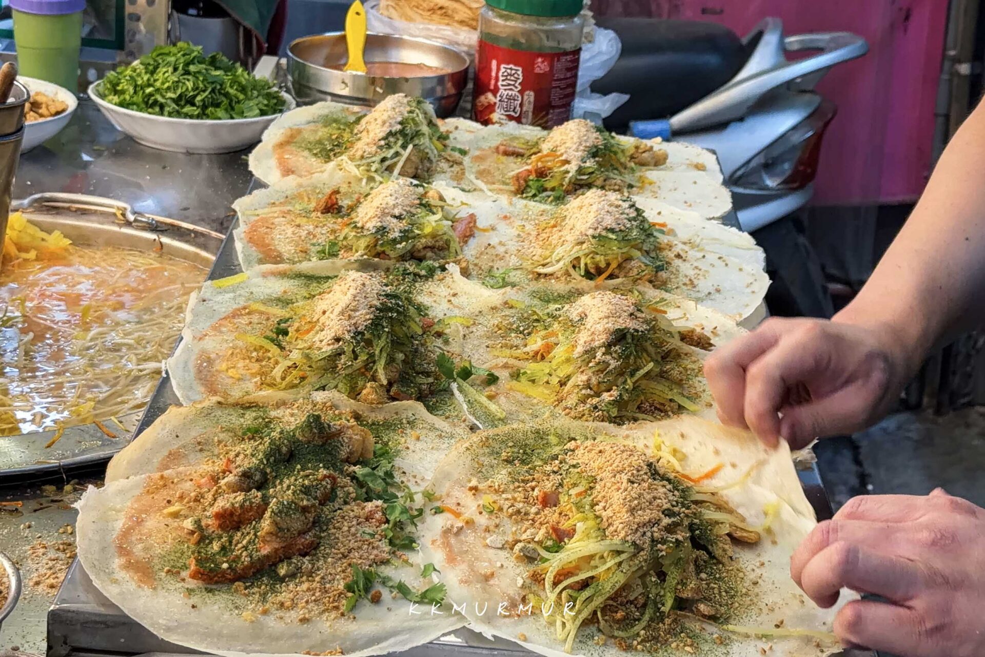 等候時可以看到老闆俐落的包著潤餅捲,堅持手工現做的潤餅皮是這裡的一大賣點,上方滿滿的蔬菜、食材與各式佐料,看著就很想趕快吃上一口。