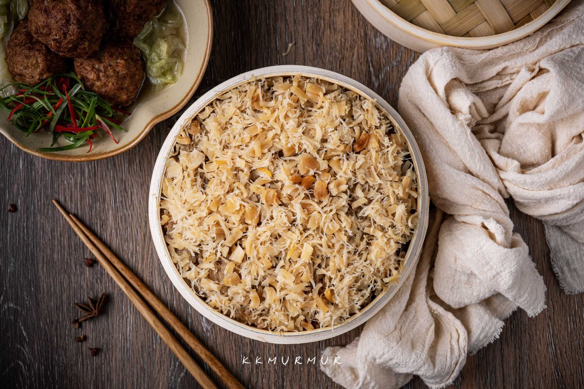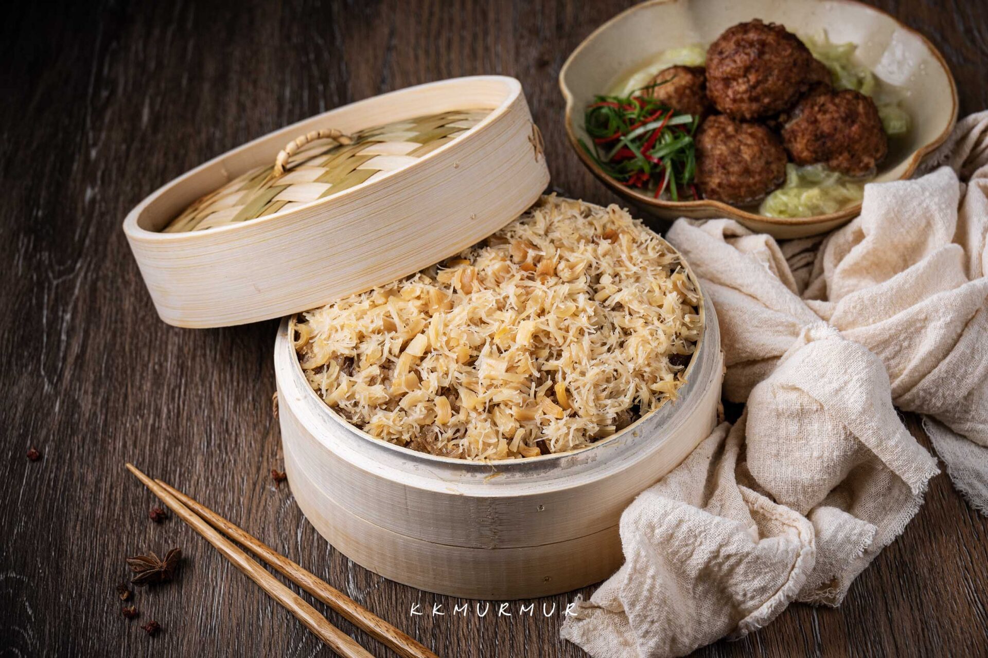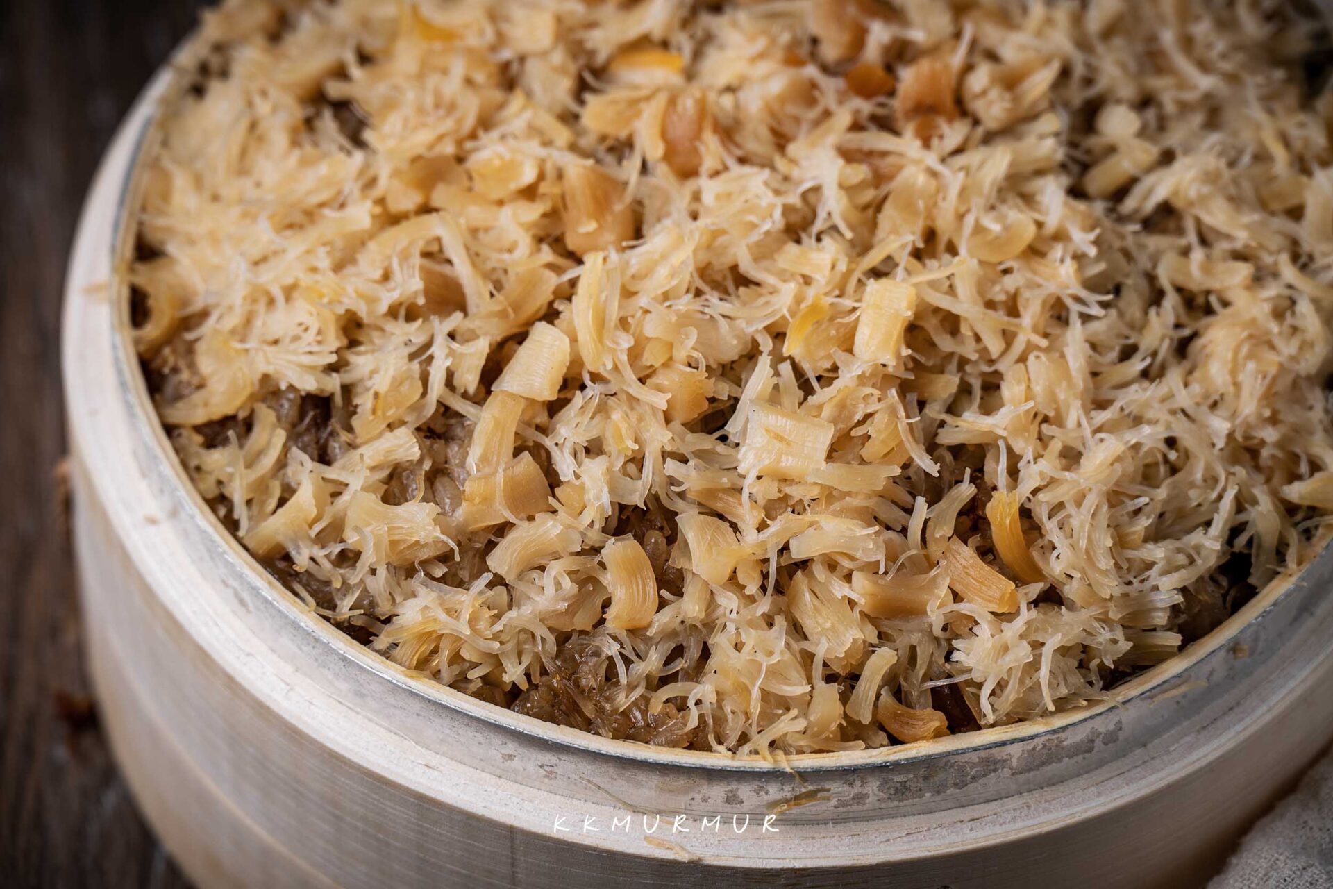 主食部分,大力推薦這個【干貝米糕】,看這滿到不行的手撕干貝絲,吃起來果真鮮味滿滿、香氣逼人。米糕是挑選尖米與圓米混合而成,比例我覺得抓得很剛好,米粒彈牙中帶點嚼勁,裏頭還有許多的香菇、蝦米與肉絲,整組搭配起來,醇鮮香一次到位。另外,出貨時是直接提供一個竹籠,客人直接把蓋子移掉放進電鍋就好,相當的便利!