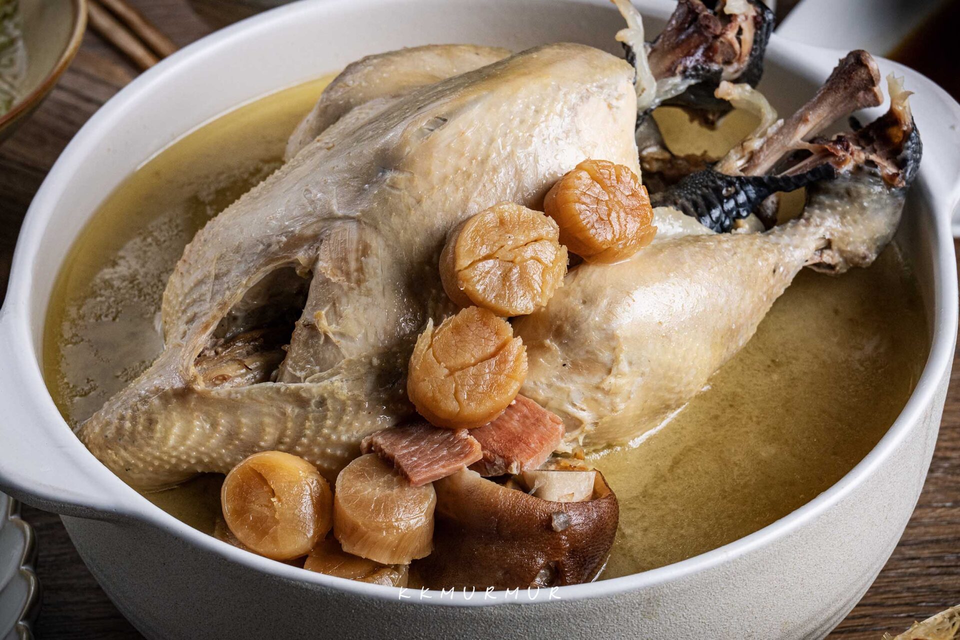 這品【員外雞湯】是果貿的招牌經典品項了,全程用了兩隻雞來燉煮,先揀選老母雞文火慢熬出精華高湯,再加入放山雞、干貝、金華火腿、豬肚、豬腳與雞腳等山海珍料細火慢燉而成。