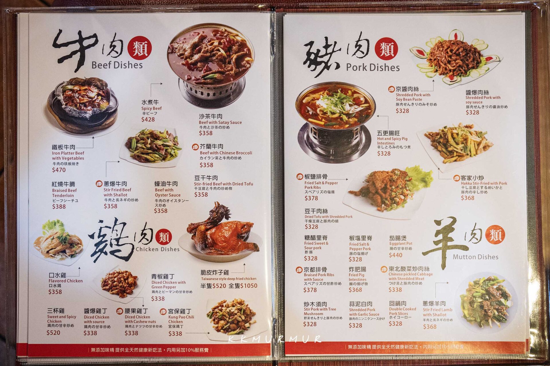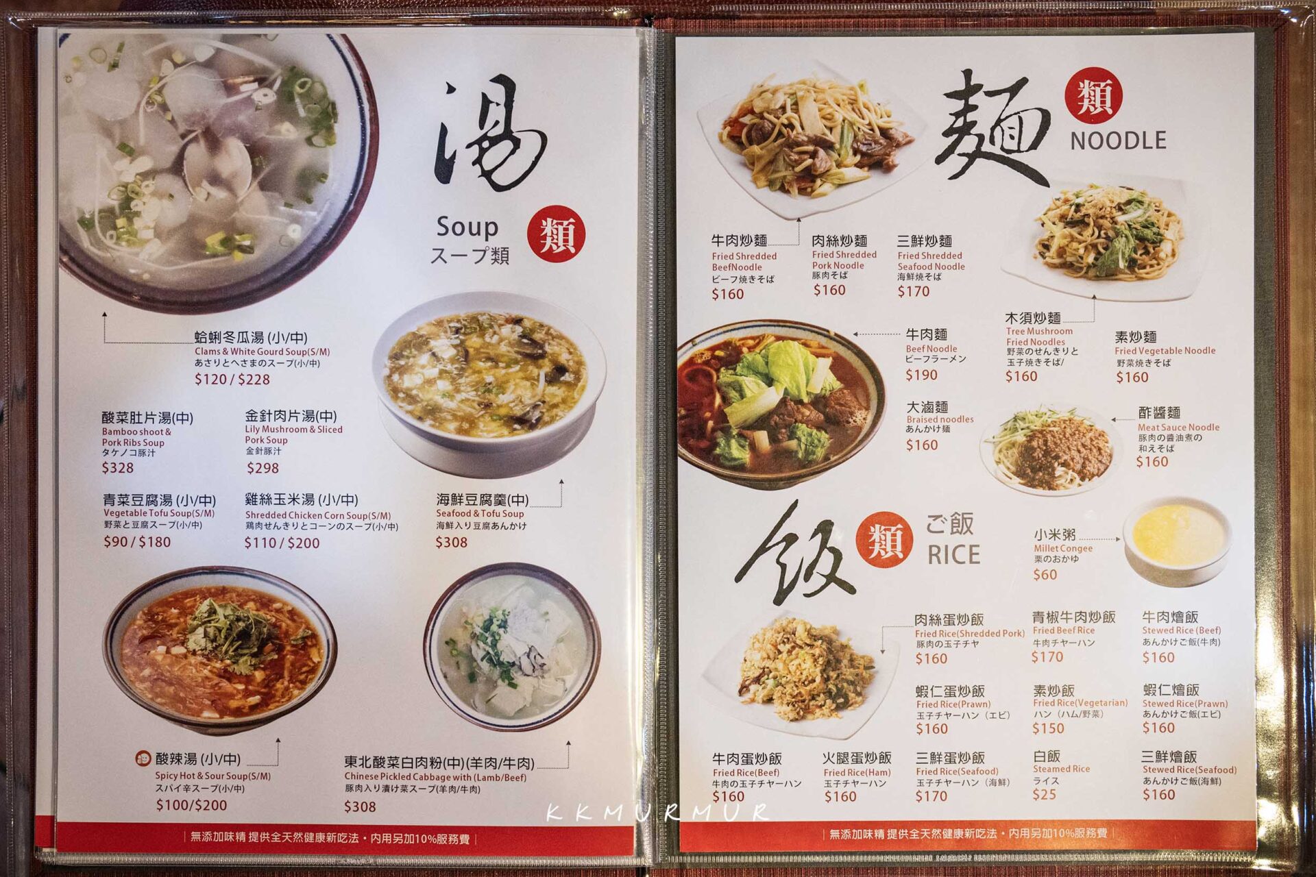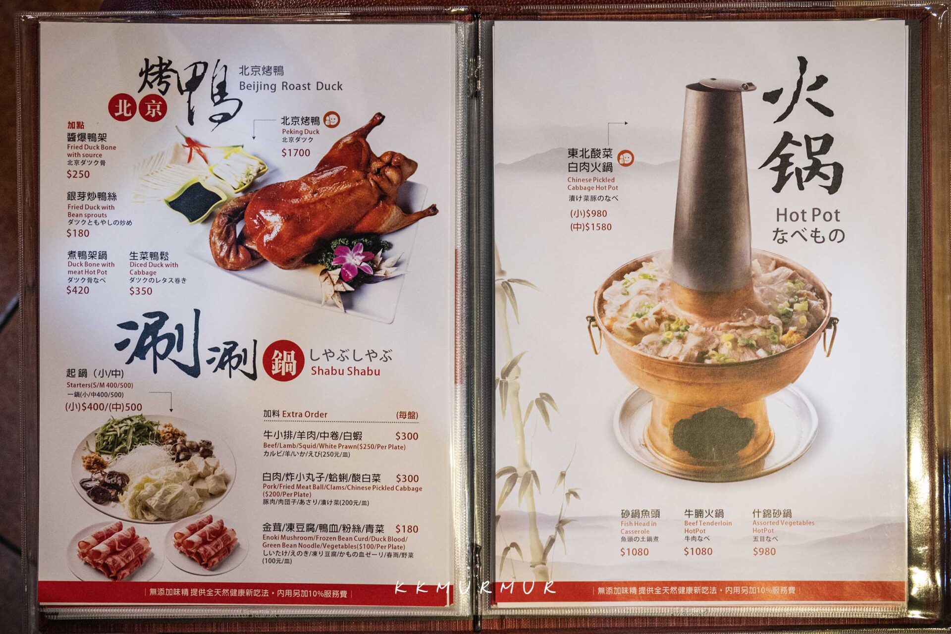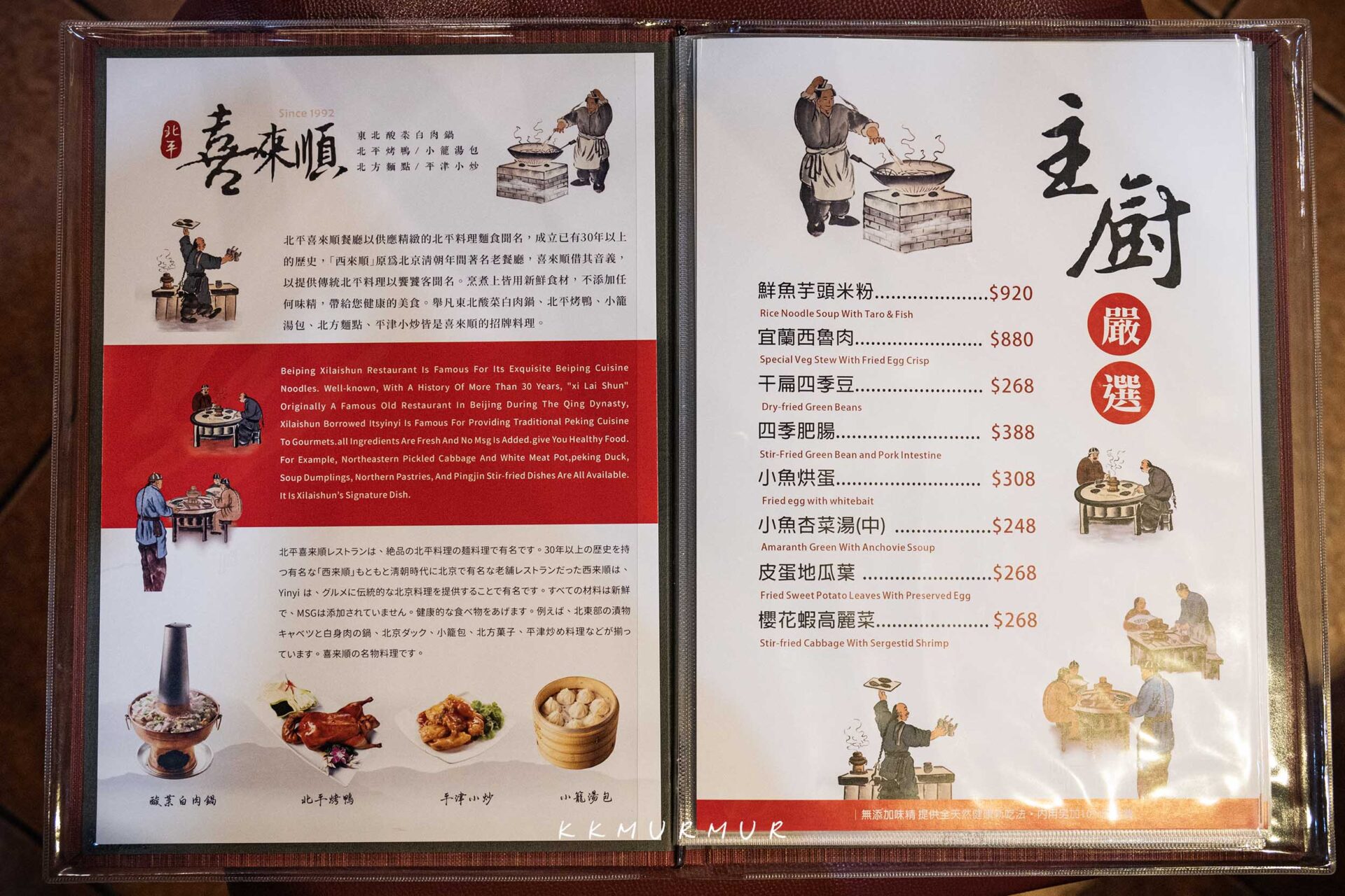 【北平喜來順餐廳】的菜單如上,主打北平料理與麵點佳餚,也有一些比較像台菜、川菜等菜系的品項,這部分跟許多合菜餐廳一樣,混血融合了各方派系料理與手法,才成就了在地客人偏好與熟悉的味道。另外也有北京烤鴨,一吃的價格為$700,若要變成二吃或三吃,可以延伸做成醬爆鴨架、銀芽炒鴨絲、煮鴨架鍋(湯)與生菜鴨鬆,定價則會根據菜色有不同的價格。