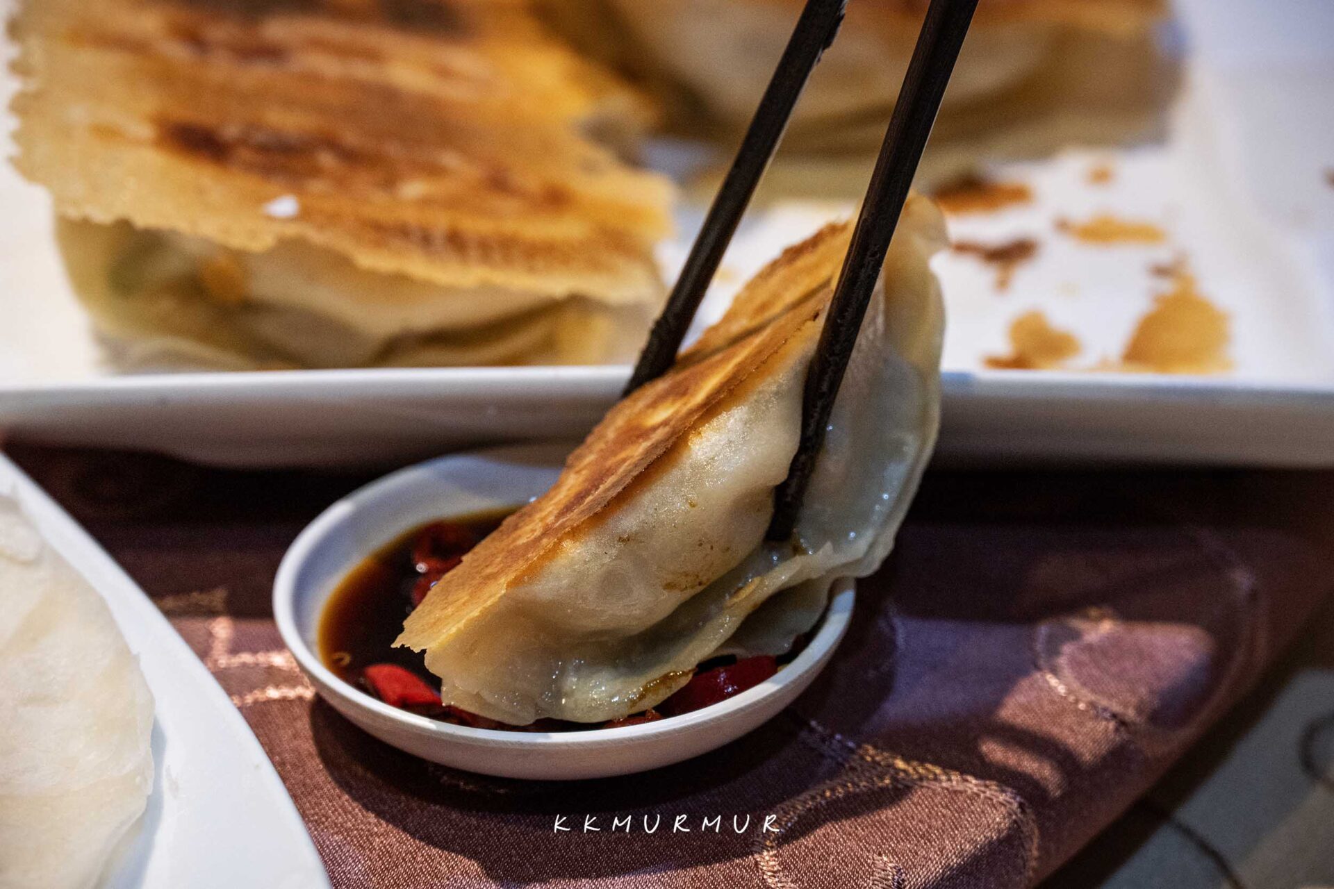 【三鮮鍋貼】這我覺得滿好吃的,塊頭很大吃起來滿過癮,外衣煎至金黃酥脆帶點微微焦香,肉餡飽滿帶汁,並能吃到整尾新鮮蝦仁,肉香與麵香整體也還滿適口的。