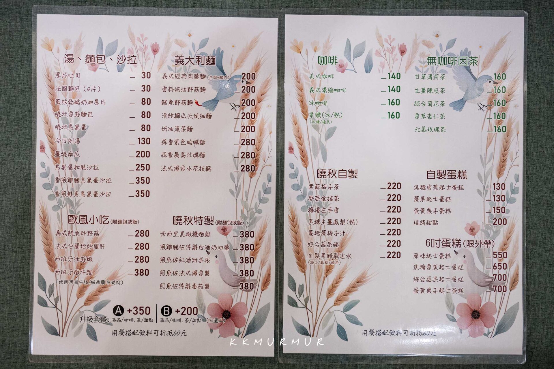 【曉秋咖啡廳】的菜單如上,從湯品、麵包/沙拉 、義大利麵、歐風小吃、特製料理、甜點到各式飲品都有提供。而甜點除了可以店內單點品嘗外,亦有提供6吋蛋糕可以整顆預訂。餐點可以升級套餐,也能搭配飲品享有$60的優惠折抵。菜單的價格我覺得很實惠,主餐普遍落在$200-$380之間,但因餐點現點現做,出餐會需要一些時間,這部分需要留意一下哦!