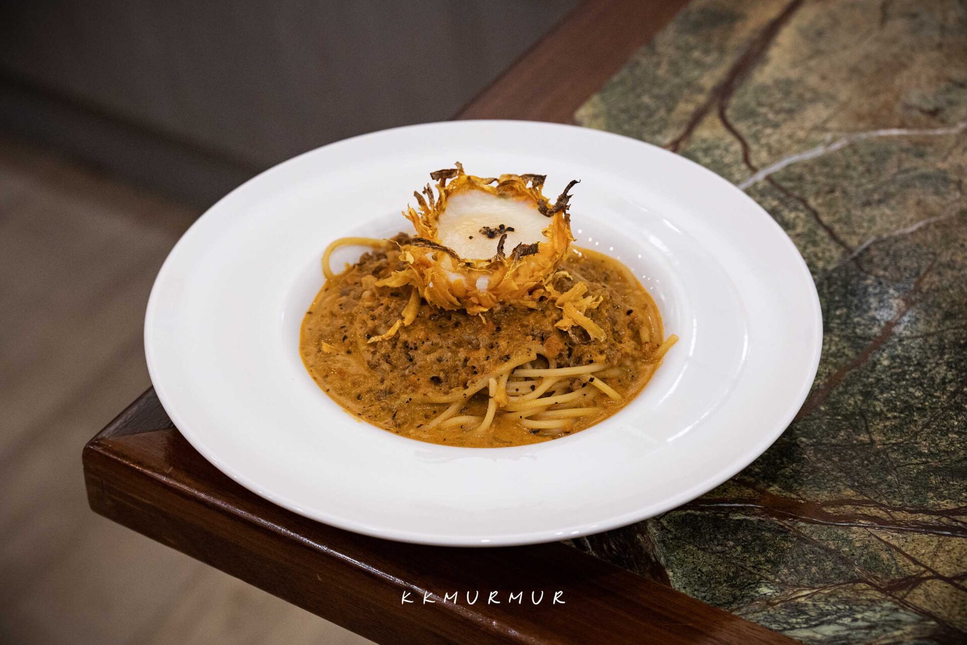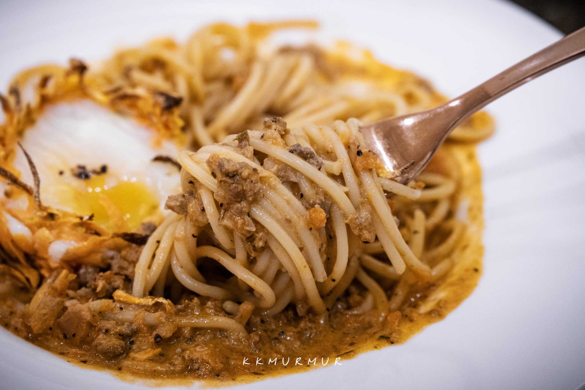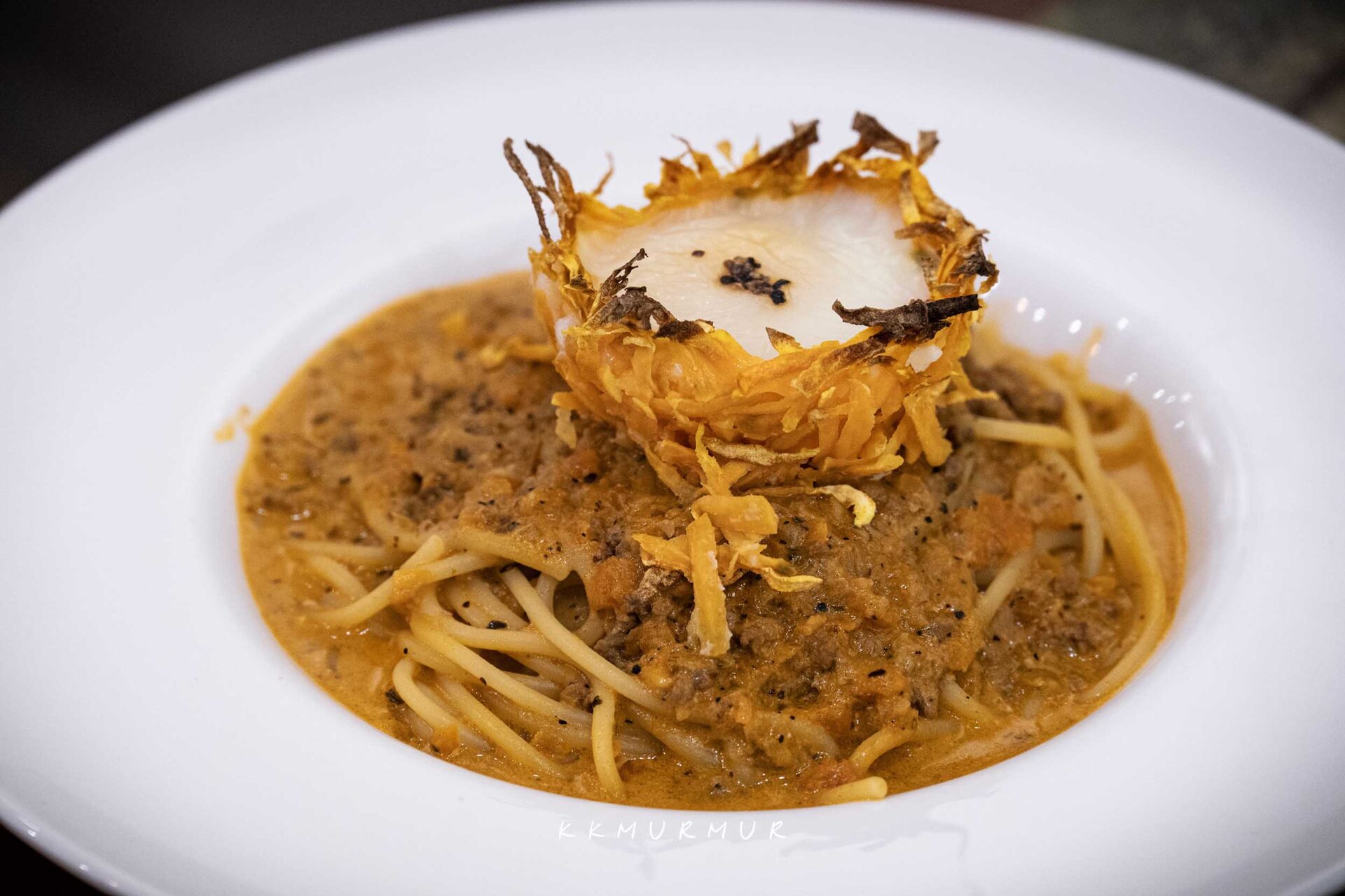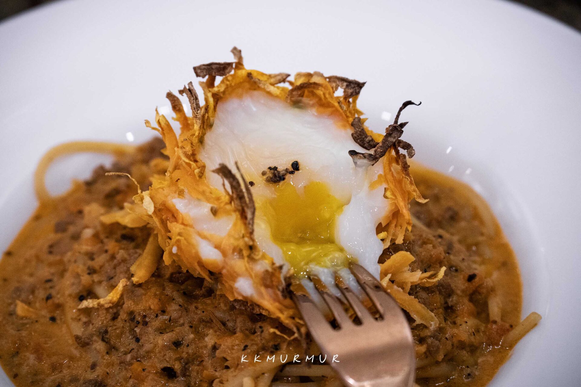 且上桌時,那個像鳥巢的半熟蛋,直接吸引了目光。以金黃帶點脆口的地瓜絲作為外衣,劃開後會看到半生熟的蛋黃,搭配著肉醬義大利麵一起享用,讓風味更為的溫順圓潤,地瓜絲的外脆內綿與香甜滋味,也讓整體的層次感更為提升。重點是這一盤的定價為$200,對應這好品質,CP值可說非常的高!