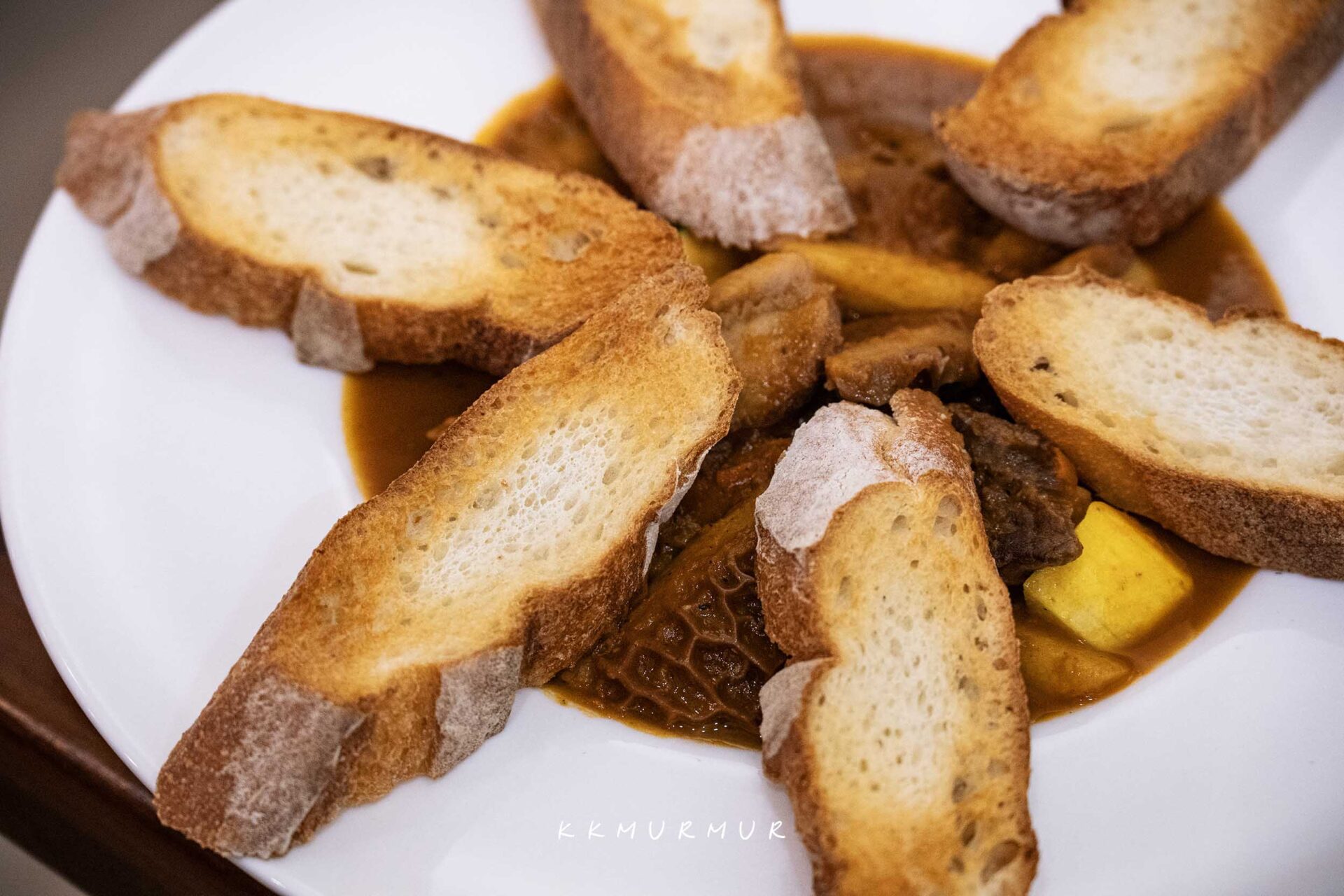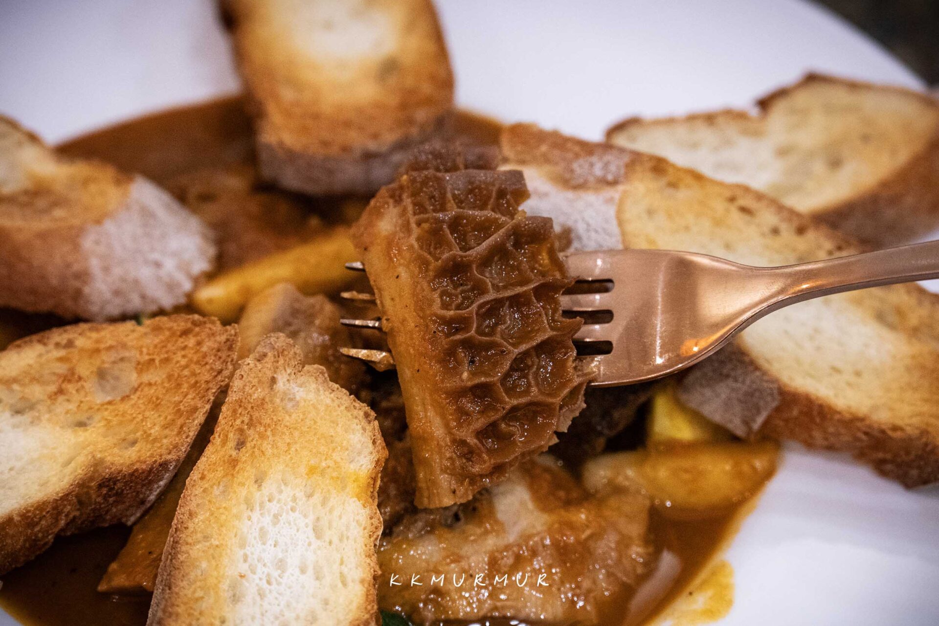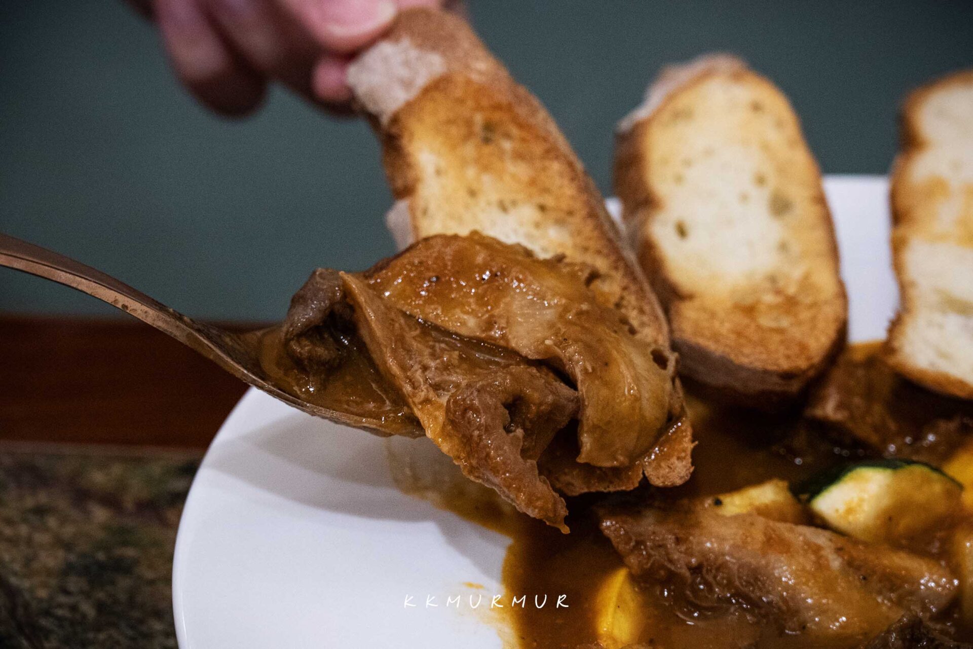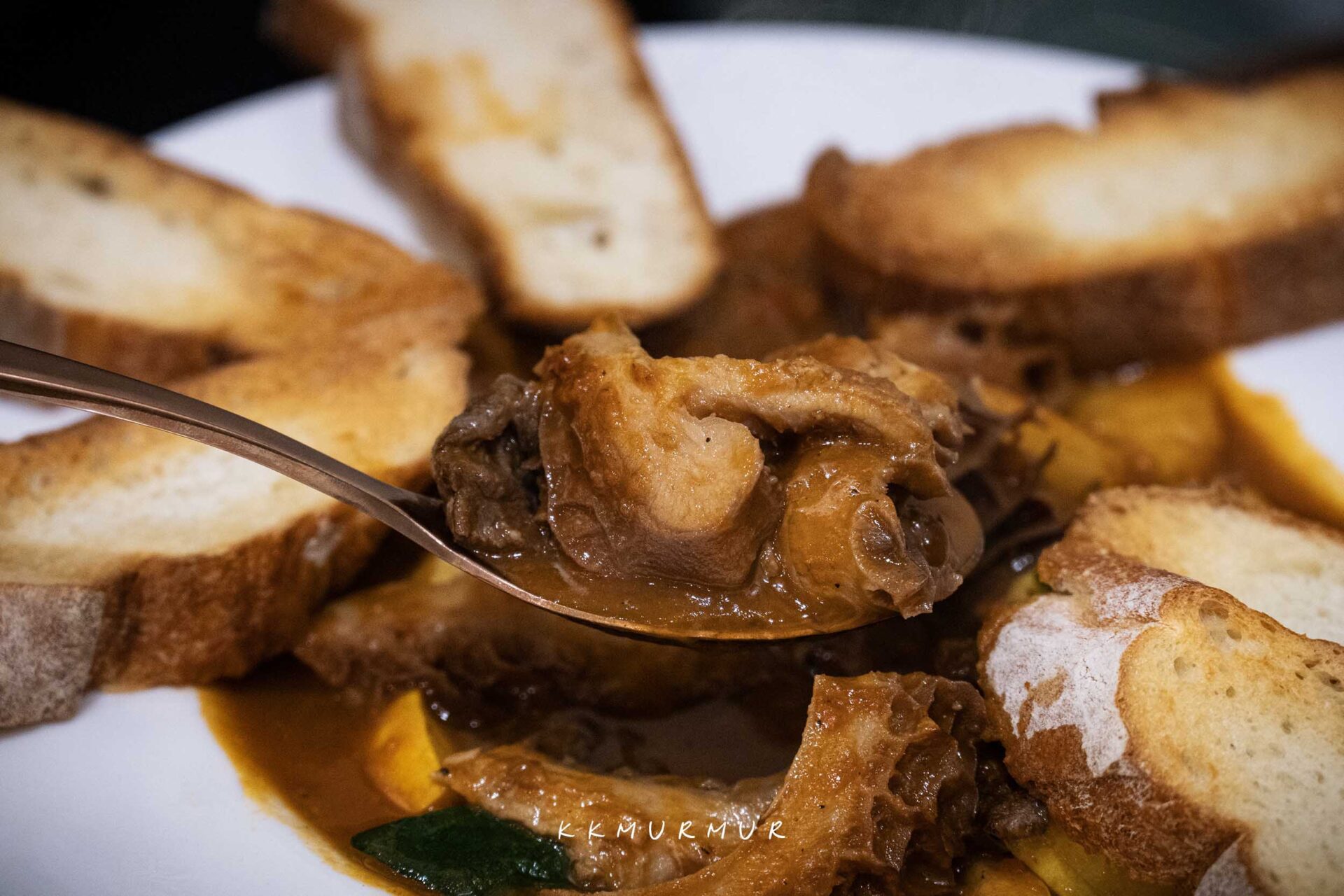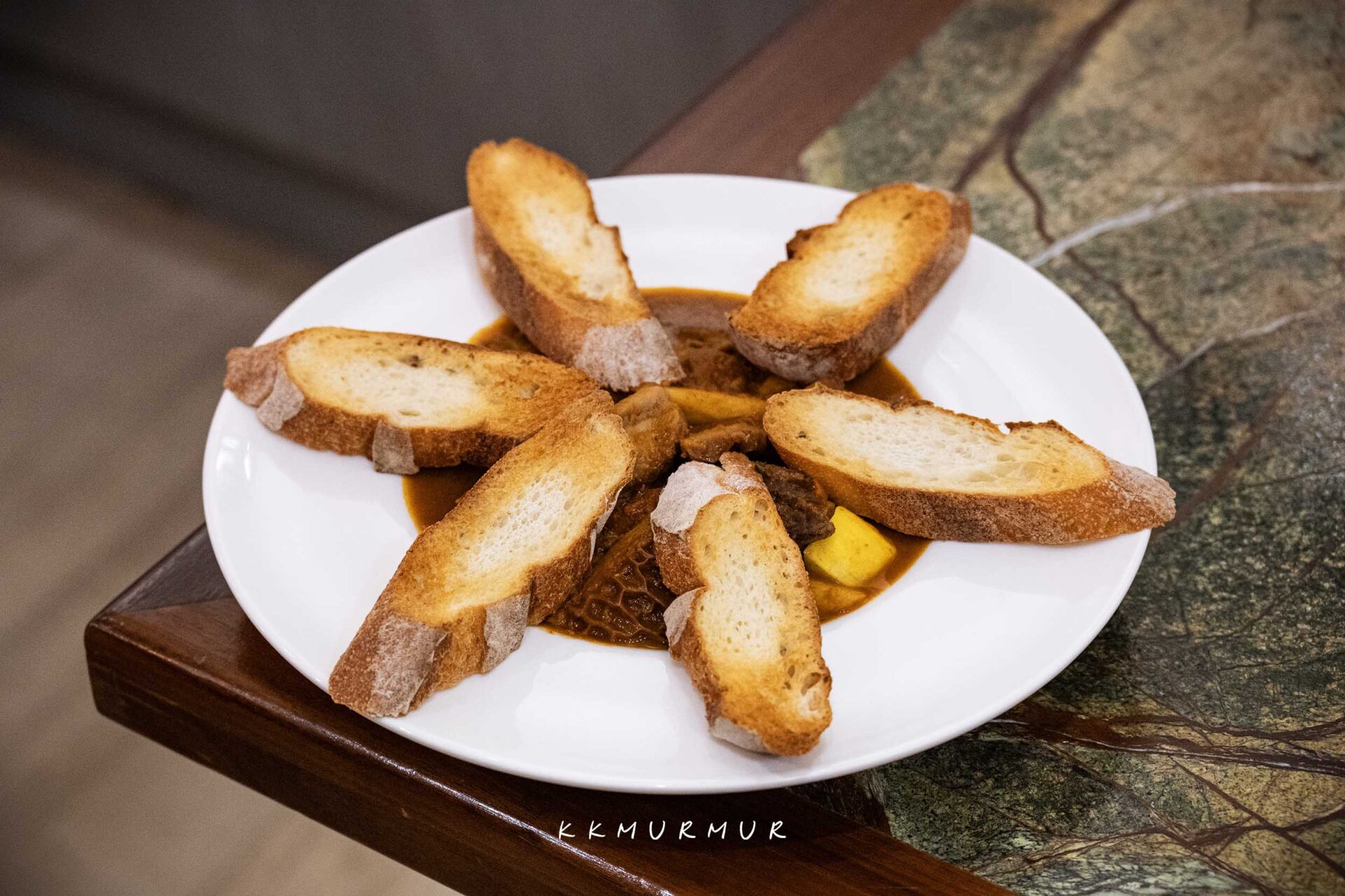 帶點筋的牛腱肉,燉至肉質軟嫩而讓人療癒,同時仍保留了讓人爽快的肉感與肉香,真的是好好吃阿。裡頭還有蔬菜塊,這些食材的自然甘甜,也被深深燉到精華醬汁中,讓這道菜的香氣與風味,層次感十足豐厚,但下手絲毫不會太過重口。附上的麵包搭配牛雜品嘗很過癮,即便只沾醬一起品嘗,也是相當的好吃!