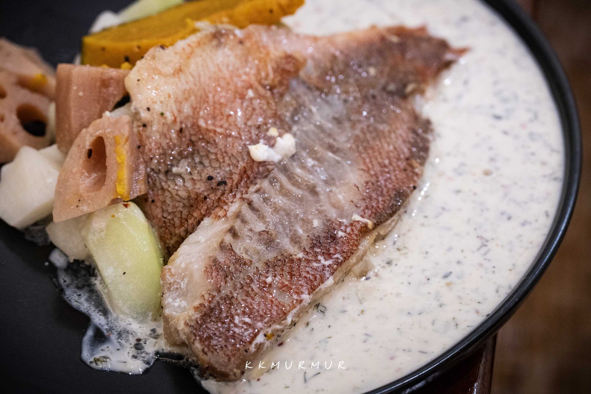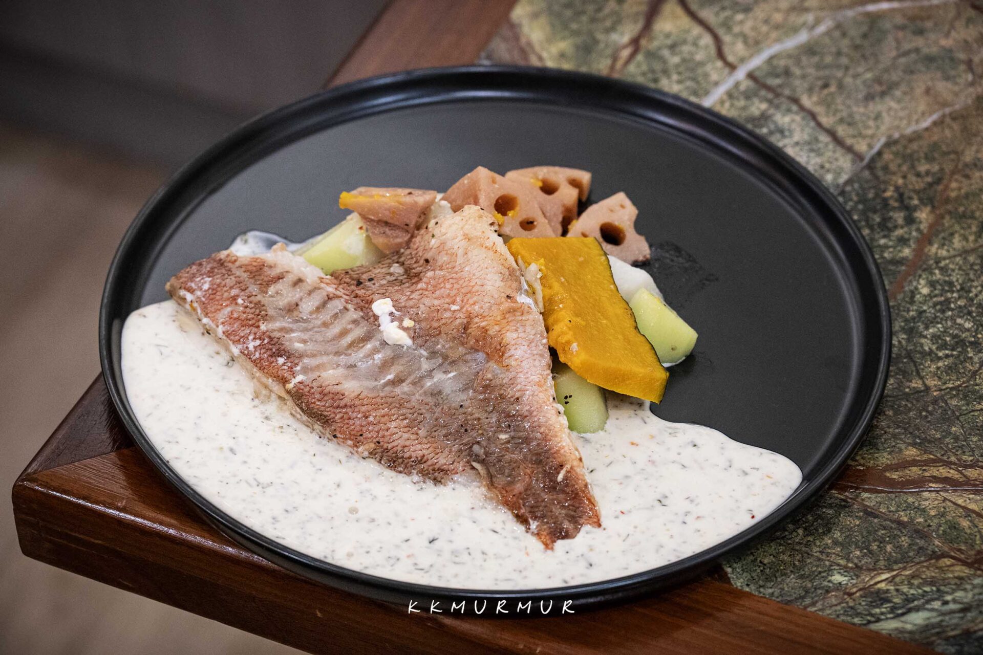 這品【煎魚佐法式檸香醬】感覺就很不錯。這天的魚種是深海魚石狗公,將魚皮煎至帶點脆口與微微焦香,魚肉肉質鮮甜Q彈,同時又不失緊密細緻的質地。最厲害也最吸引我的是那法式檸香醬,顏色乍看以為是奶香味很重的類型,實則是有著很順又清甜的檸檬酸香,但酸口感又不會太過強烈,搭配草本香料的點綴,整體的平衡感極度優秀,搭配魚肉能襯出肉質的鮮甜,麵包沾取品嘗也是別有一番滋味。