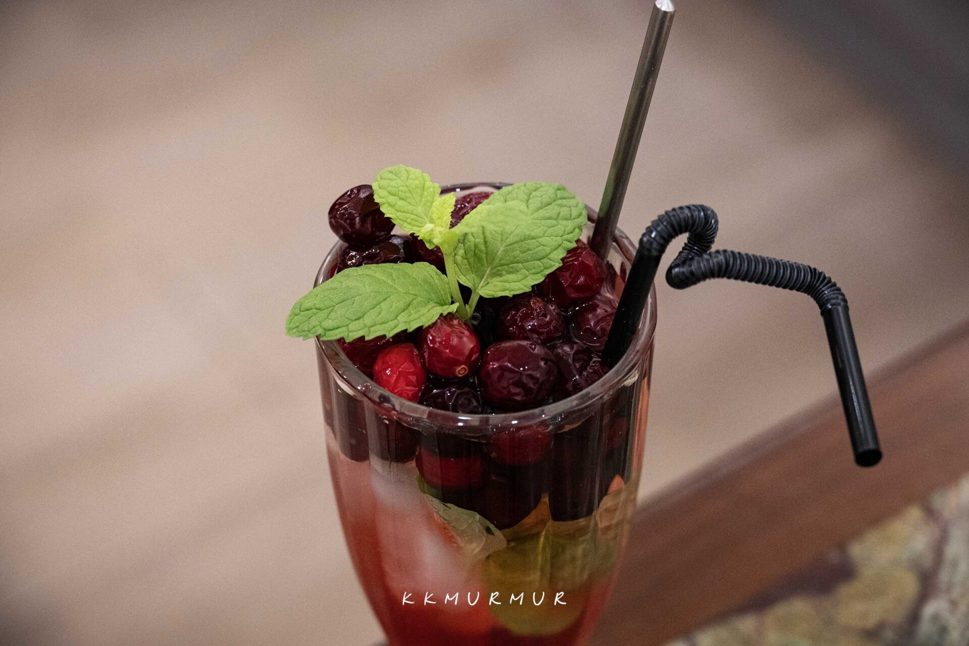 【蔓越莓梅子汁】選用了老闆自釀的梅子,搭配上層滿滿的大顆蔓越莓,酸甜誘人又爽口,發酵的氣息其實還滿鮮明,這部分就見仁見智,我個人是滿喜歡的,也讓這杯飲品更多了幾分特色,大口咬下蔓越莓會在口中爆汁,也是很過癮!