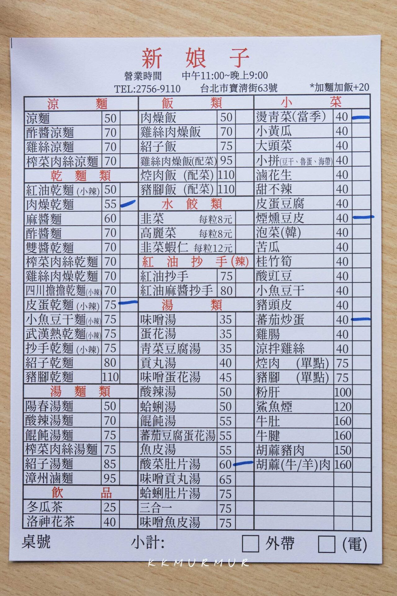 【新娘子麵店小吃-寶清店】的菜單品項很豐富,舉凡各式麵類(涼麵/乾麵/湯麵)、飯食、水餃/抄手與湯品都應有盡有,還有多款小菜可以挑選。主食價格落在 $50-$110 間,水餃則是一顆 $8-$12。招牌必點的話就是皮蛋乾麵,酸菜肚片湯也是很多人的大力推薦,若是初次到訪,推薦可以這樣點看看!