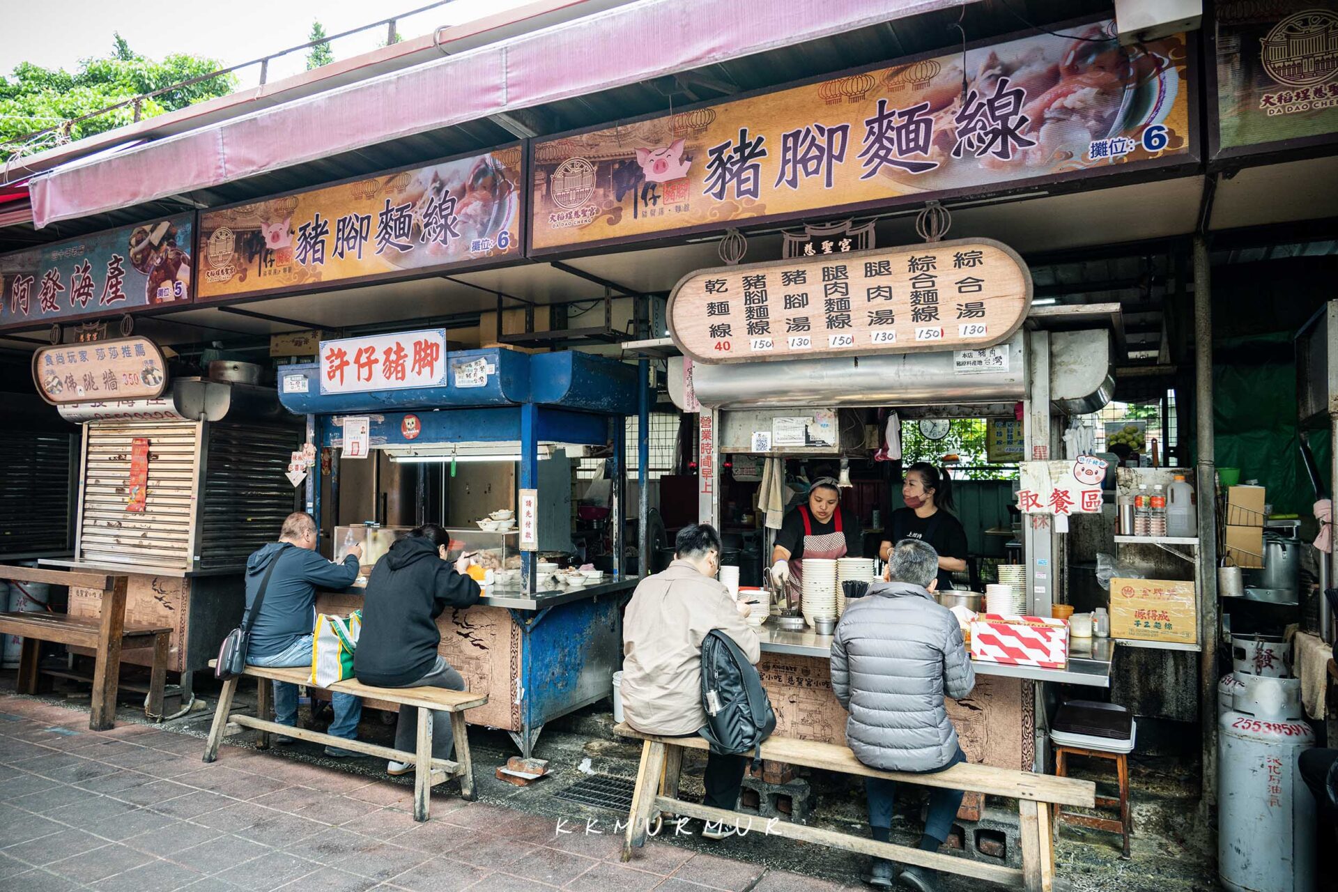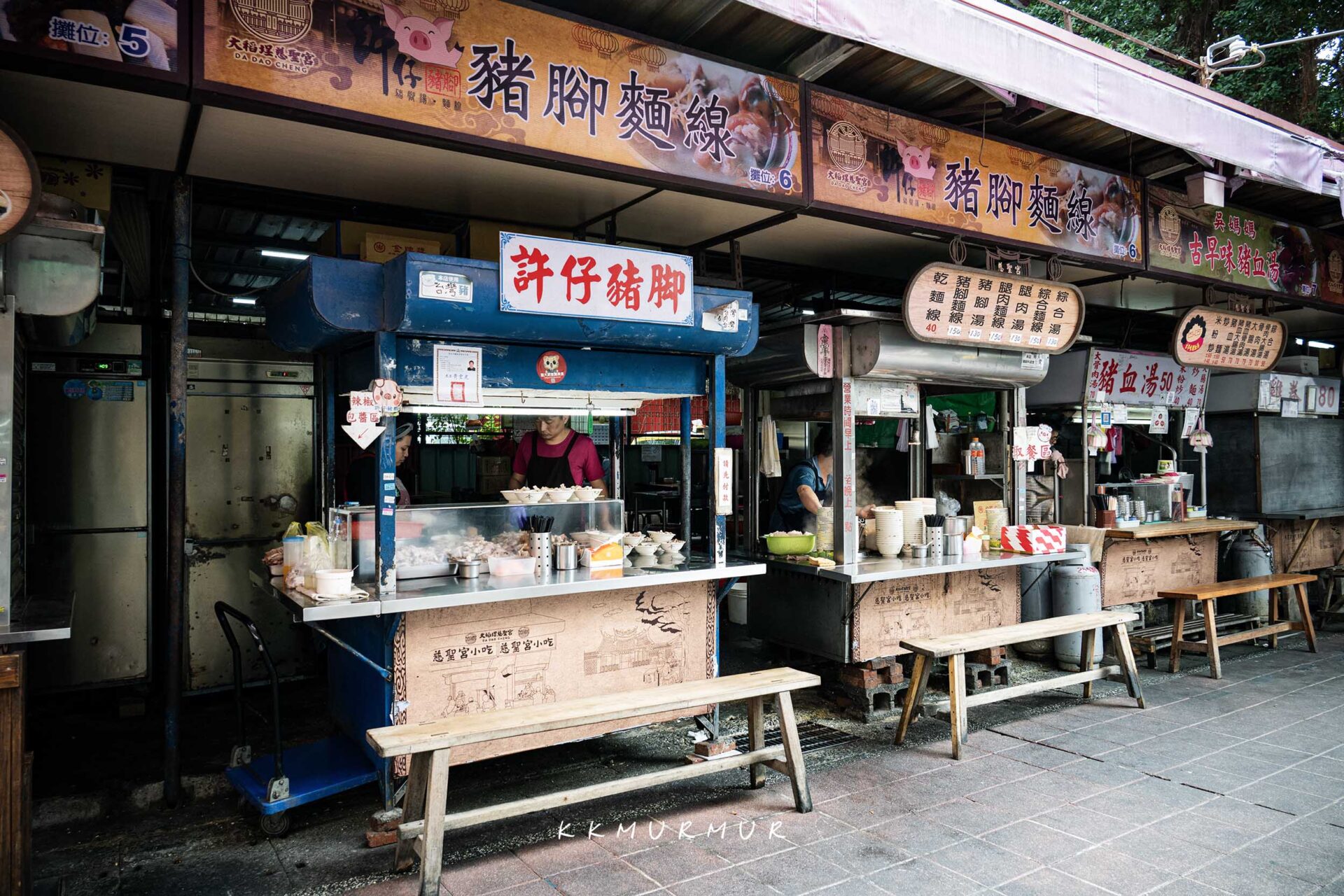 我們是平日上午約10:30到訪,當時已陸續有客人在料理檯前用餐,除了長板凳這邊的座位外,往店內走的鐵皮屋下還有一些桌椅可供使用。另外,因慈聖宮榕樹下沒有【許仔豬腳麵線】的專屬座位,因此不能端到樹下吃,這點要記得留意一下哦!