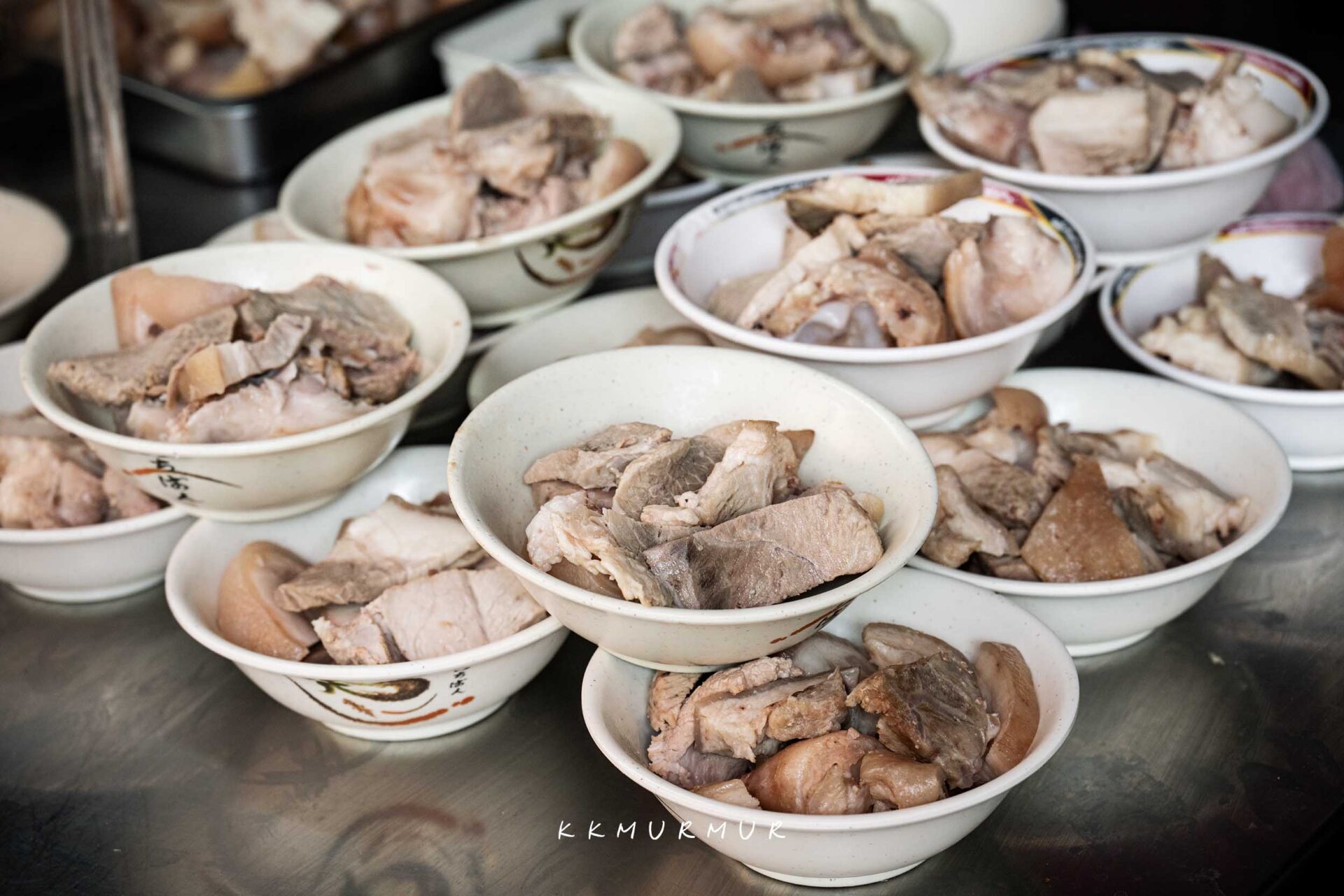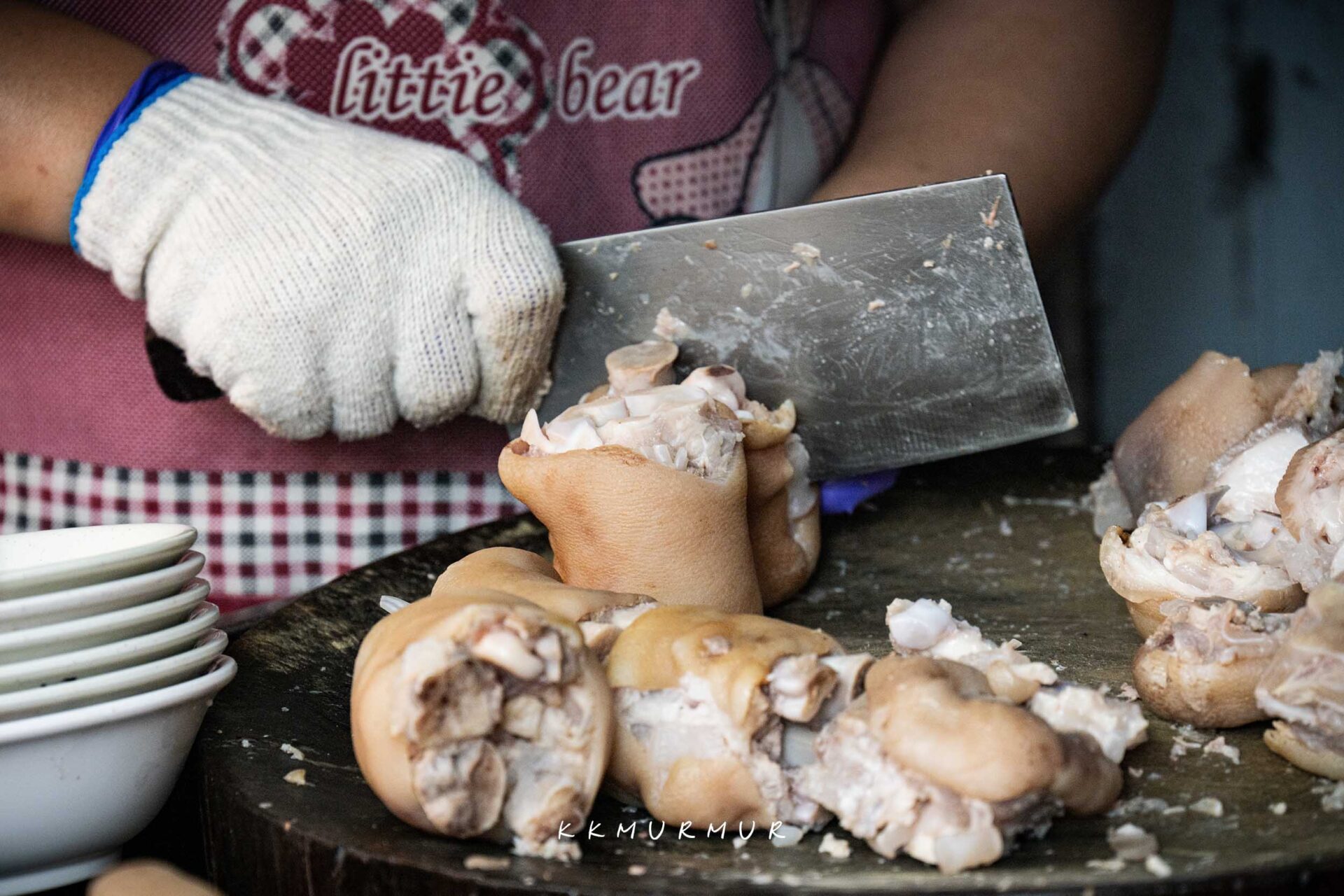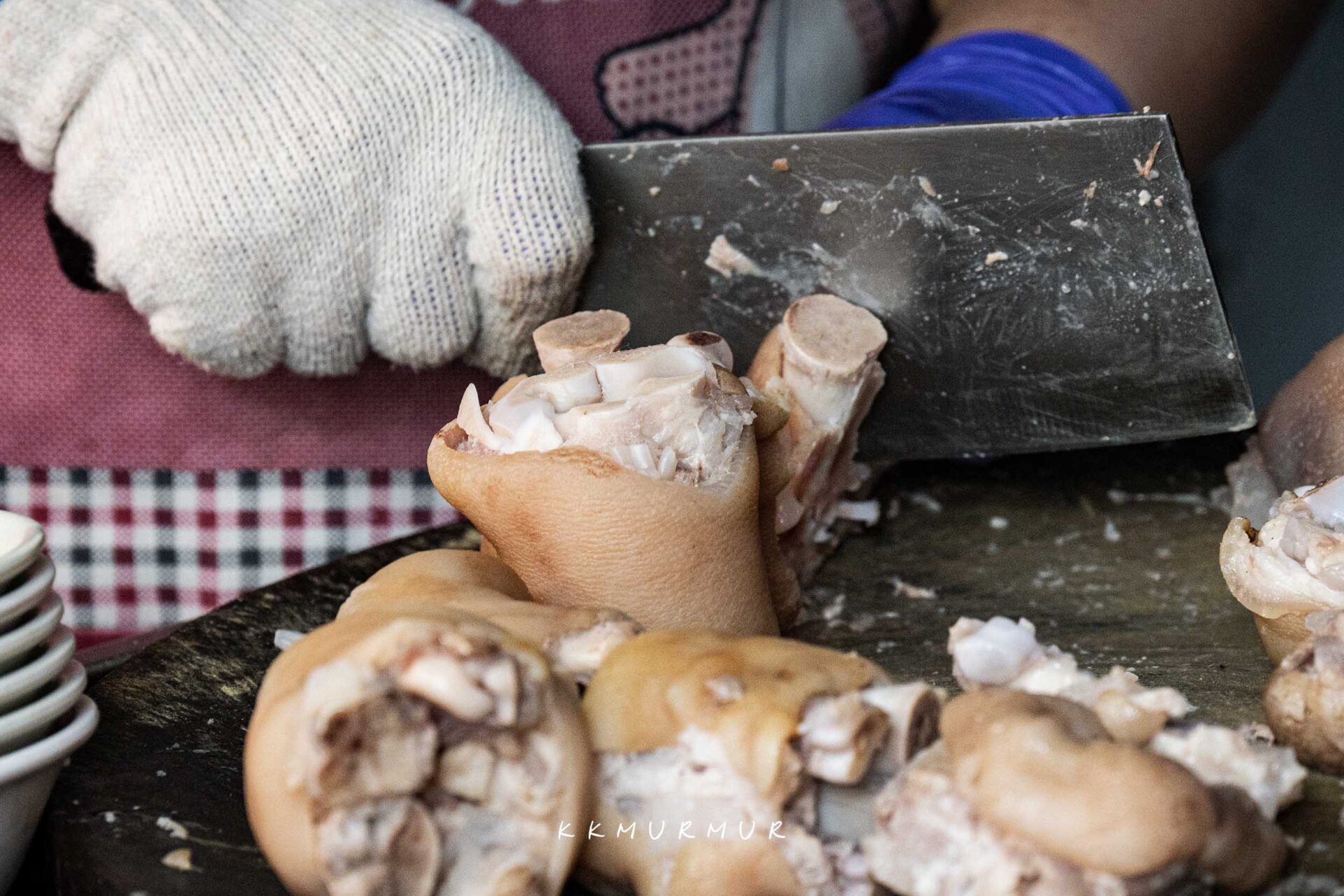 我們這天是坐在料理檯前,可以看到店員一刀一刀處理著豬腳,看著這過程還是很爽快又療癒的。而檯面上也有一碗碗先裝好的豬腳與腿肉,因此點餐後沒多久就可以拿到餐點囉!