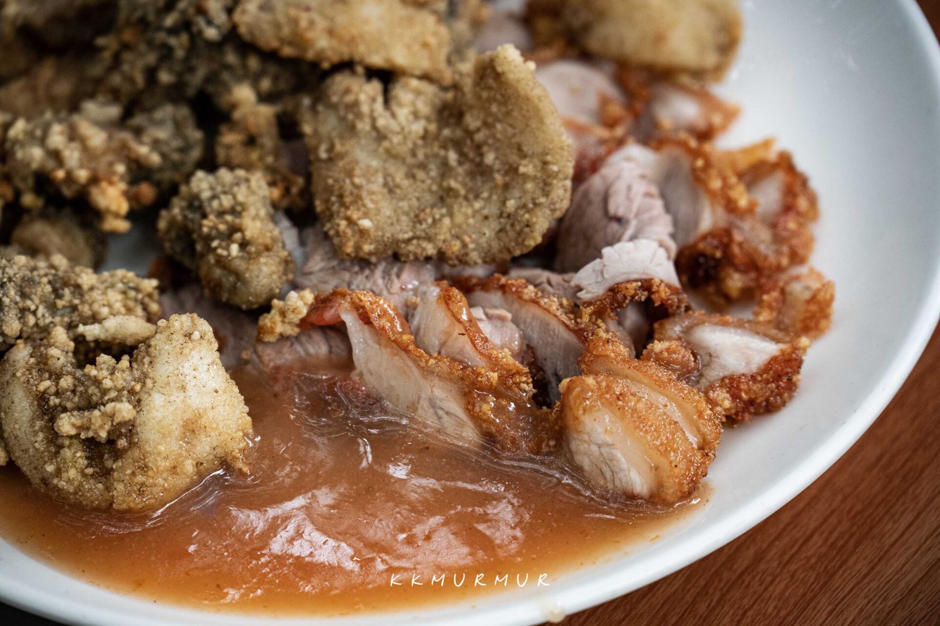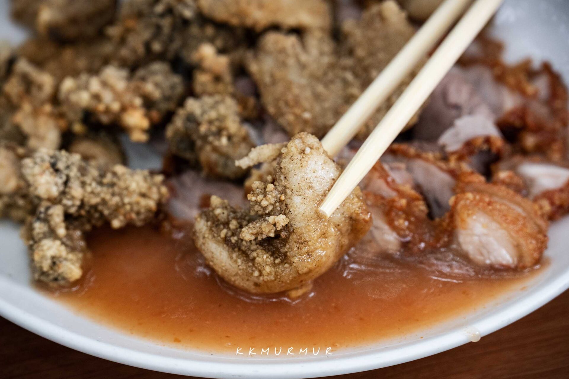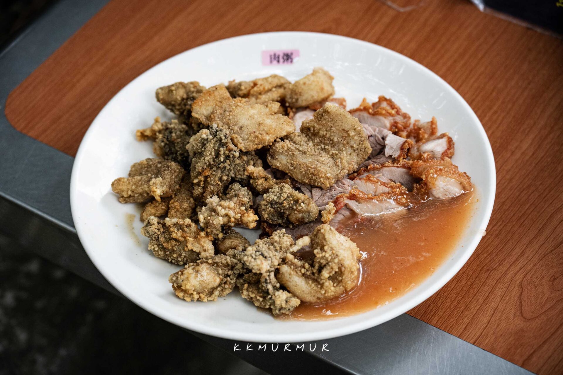 我們點了【紅燒肉】【花枝炸】與【蚵仔炸】,師傅會將多整炸物放在一盤,並附上一些沾醬可供搭配。