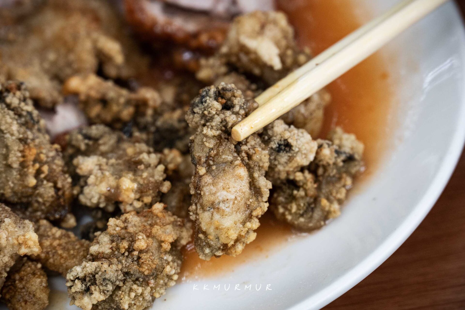 【蚵仔炸】的個頭不大,不會有那種咬下就爆汁的品嘗體驗。香酥感一般,但鮮度還算不錯、沒有腥味,建議可以搭配著沾醬一起品嘗,層次感會更為豐厚。