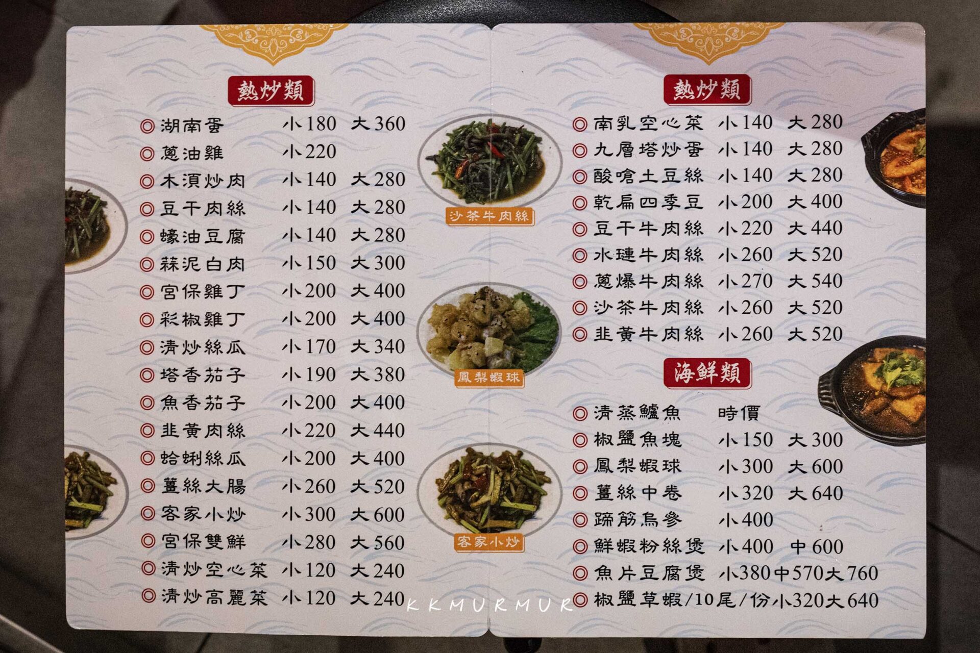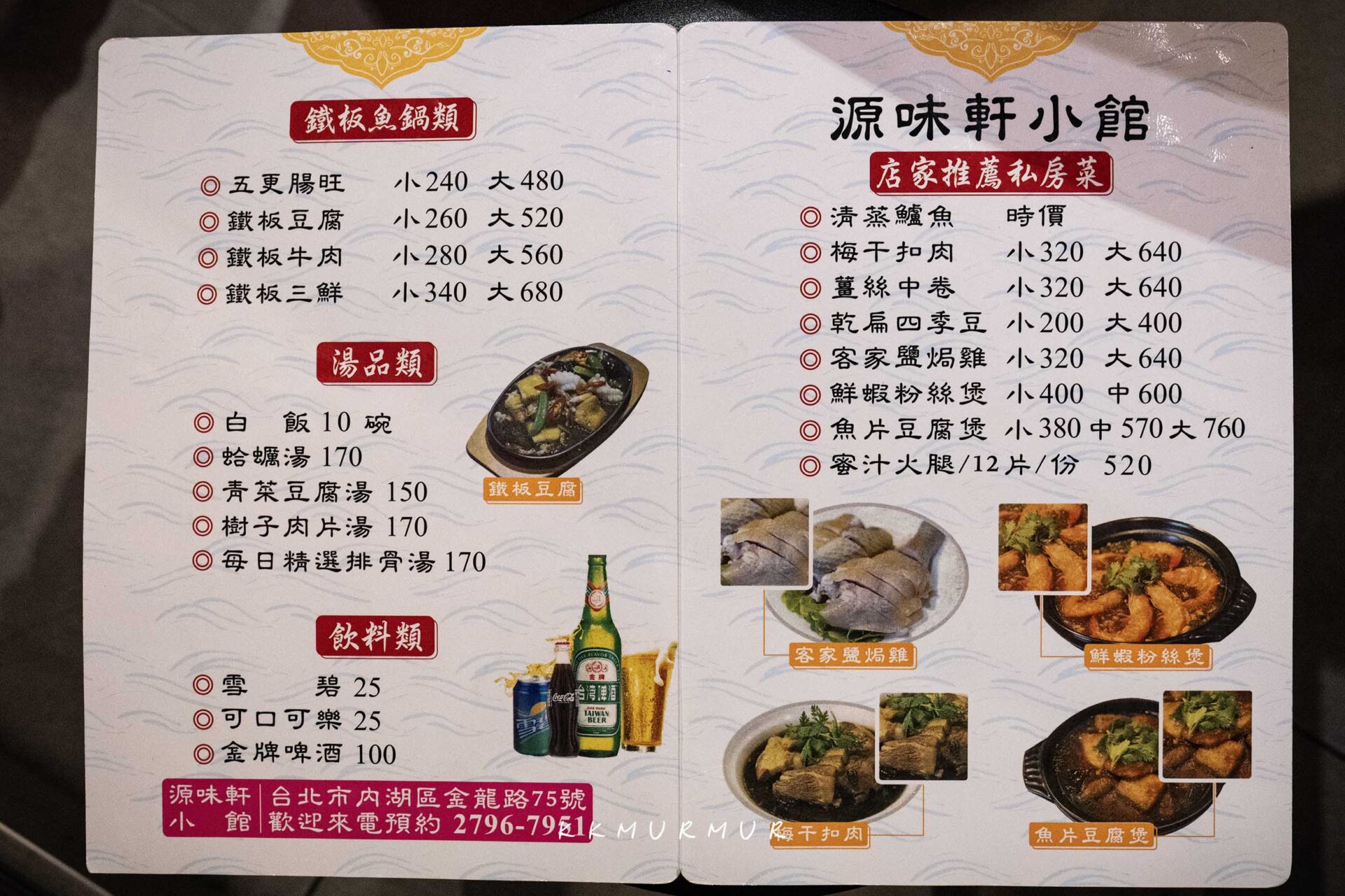 【源味軒】供應的菜色,以不算太大的店面來說我覺得其實滿多的,包含了經典熱炒菜色、各式海鮮、鐵板料理與一些湯品可供選擇。每道菜都有分大、小盤,且各道菜的價格算是滿親民的,且竟然還有蜜汁火腿,可惜無奈我們當天人太少,所以就沒有點了。