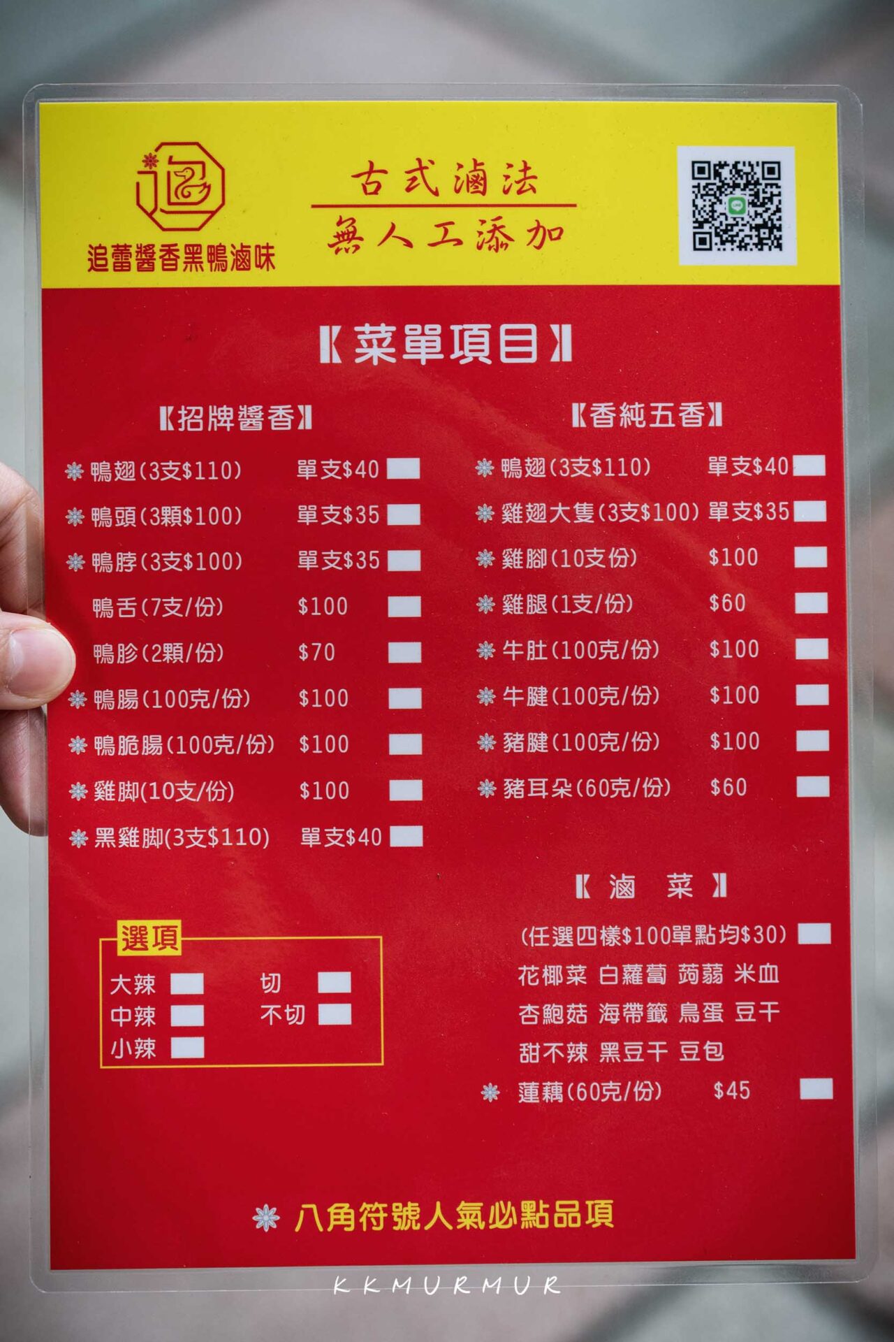【追蕾醬香黑鴨】的菜單如上,通通堅持當日現滷,滷味共分為三大類,包括【招牌醬香滷味】、【香純五香滷味】與【滷菜】,菜單中有打八角符號的則人氣必點品項,可以參考看看囉!